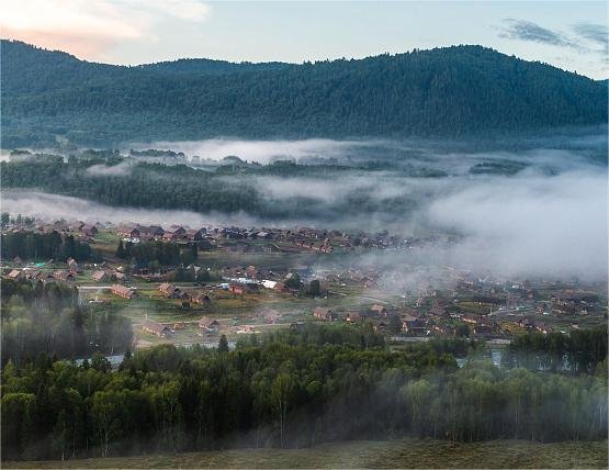 In the morning, when the sun shines on the Baihaba village, the surrounding fog is rising, the smoke of the Tuva family is curling around, and the cattle and sheep are walking along the road, which is a fairy tale world.