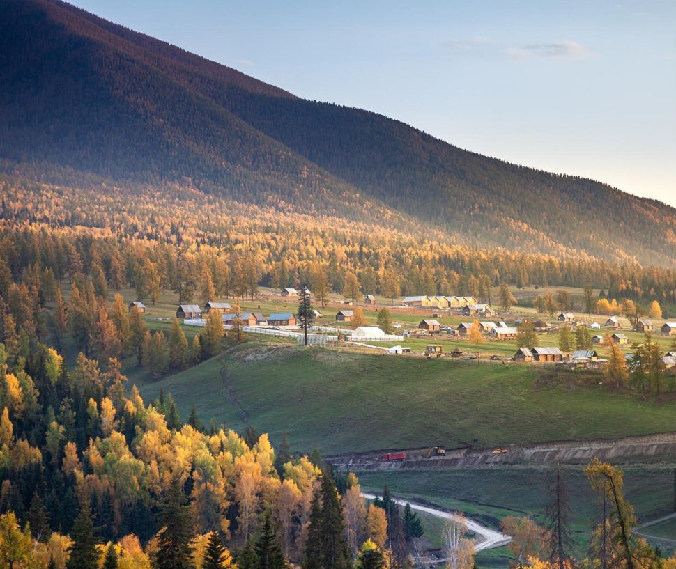 The mountains and valleys rise and fall, the white clouds flow in the blue sky, the Siberian larch is dyed yellow and red, and the genial sun shines on the golden leaves through the cracks of the trees, just like an oil painting.